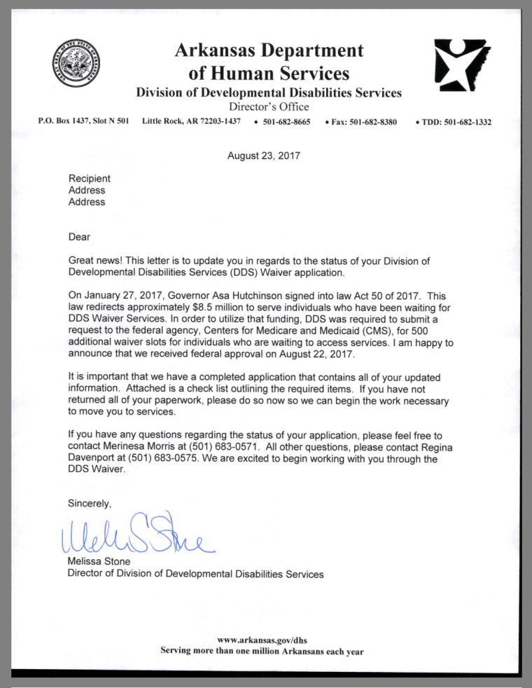 In February 2017, DHS notified 500 people that they would be receiving the funding to come off of the waiver waiting list this year. They sent paperwork for each recipient to fill out. In July, they sent another letter.