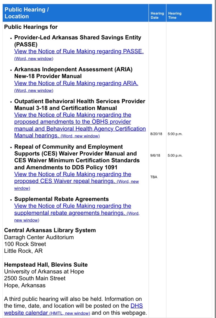 (3) Public Comment. Anyone can participate in the public comment process. Comments can be sent by email to becky.murphy@dhs.arkansas.gov or by mail to Office of Policy Coordination and Promulgation, P.O. Box 1437, Slot S295, Little Rock, Arkansas 72203-1437. Comments must be submitted by 4:30 p.m. on November 7.