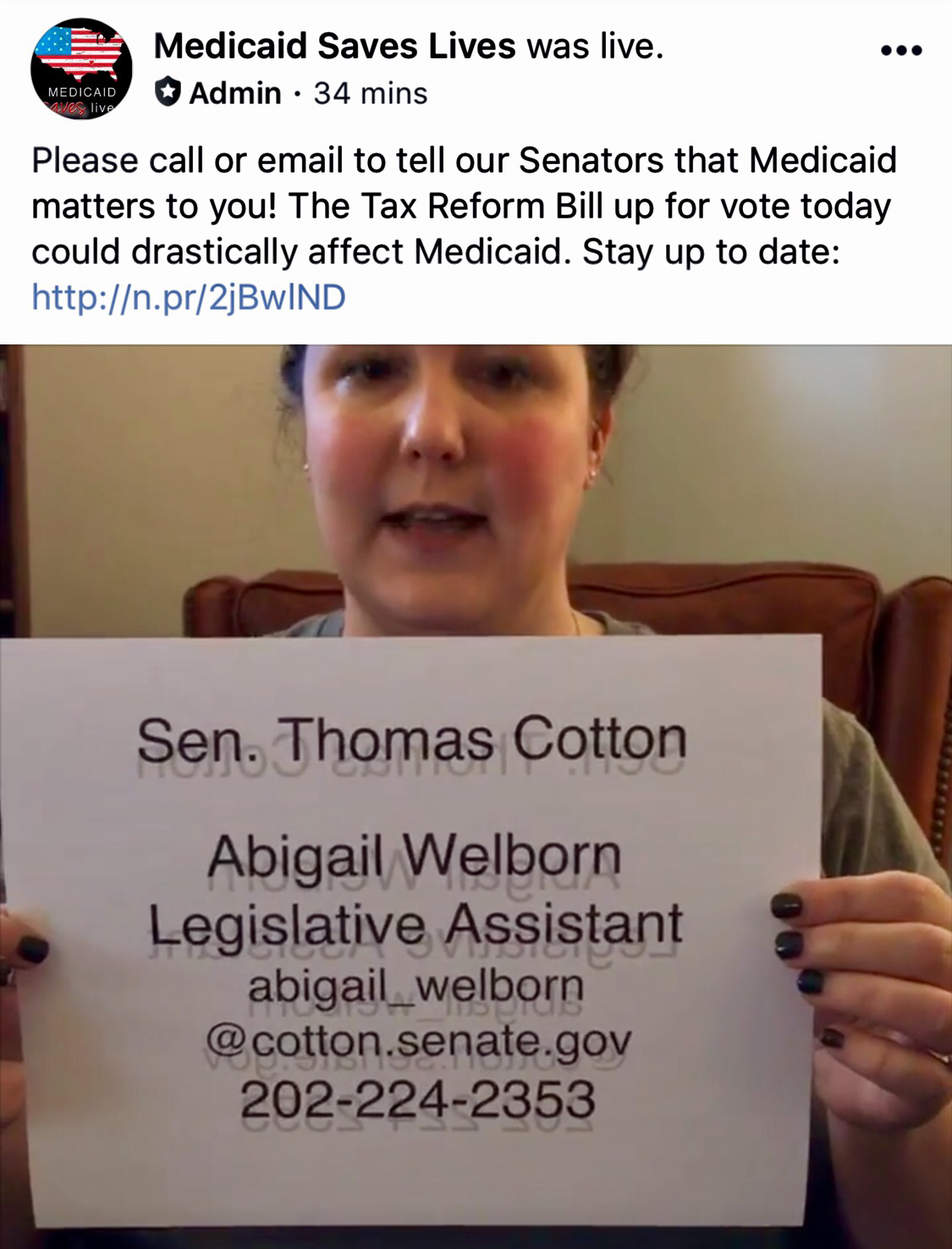 Especially if you’re a Medicaid recipient, let the people in charge know that we need Medicaid, and let them know what it does for us. Tell them thank you, and ask them to keep directing funding to Medicaid. Send them a photo of the person who is helped by Medicaid.